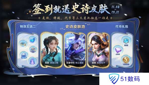 活动开放时间11月28日-12月11日,进入活动后可选择:随机史诗皮肤奖池、局内特效5选2奖池、金币铭文钻石大礼包。