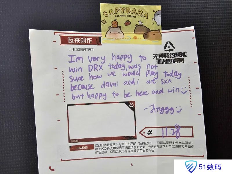 在无畏契约源能亚洲邀请赛中,PRX战胜DRX挺进胜者组。赛后,Jinggg在纸板上写道:我不确定今天我们能打成什么样,因为d4v41和我都生病了,能赢下DRX我很高兴。