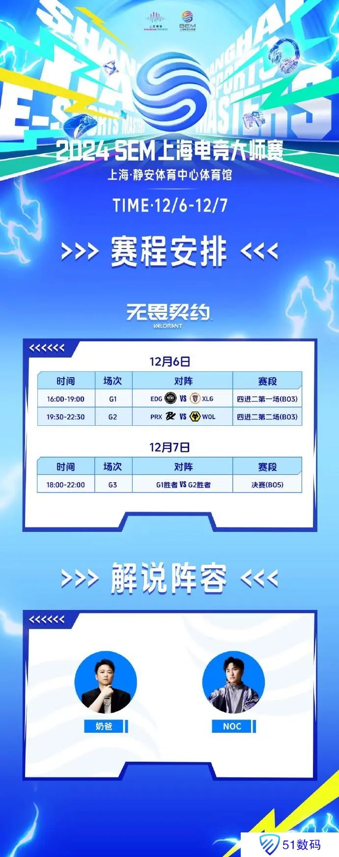 上海电竞大师赛无畏契约项目赛程已经出炉:12月6日两场BO3,分别是EDG对阵XLG以及PRX对阵WOL,12月7日将会是前一日的两支获胜队伍进行BO5对决。