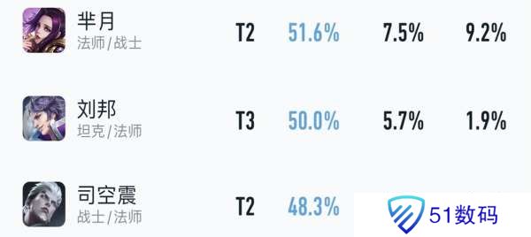 芈月巅峰赛胜率从52.2%下滑至51.6%,刘邦巅峰赛胜率从50.5%下滑至50%,司空震巅峰赛胜率从48.7%下滑至48.3%。