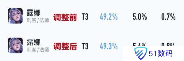 调整后巅峰赛胜率从49.2%上涨至49.3%,加强肯定是加强了,但是适用场景比较有限,而且露娜的上手门槛也摆在那儿。