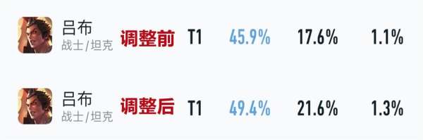 调整后吕布的巅峰赛胜率从45.9%飙升至49.4%,作为一个出场率超过20%的英雄,这个胜率已经跟巅峰吕布相差无几了。