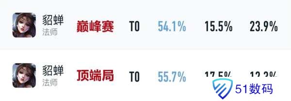 貂蝉原本应该是此次改动针对的主角,但是对她几乎没有产生任何影响,调整后巅峰赛胜率54.1%、顶端局胜率55.7%。