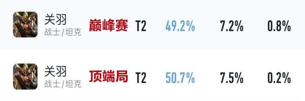 调整后关羽的巅峰赛胜率49.2%、顶端局胜率50.7%,对于熟练度较高的玩家来说,上周关羽的调整肯定算得上一次大加强。